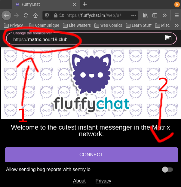 "https://matrix.hour19.club", THEN you can click "CONNECT"... (side note: you can